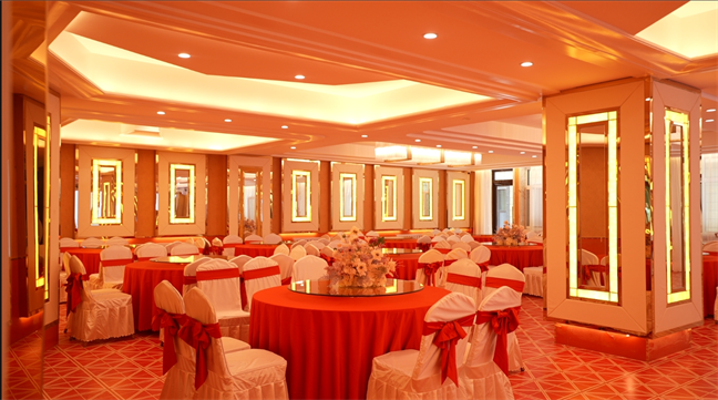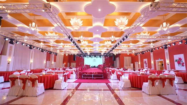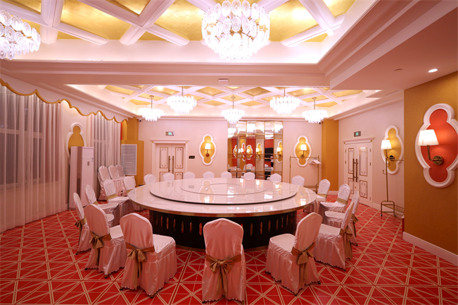 皇宮廳—金碧輝煌、皇宮式裝修,面積1038㎡,層高8.6米,配備愛(ài)情階梯、軌道威亞、二層觀禮臺(tái)、浪漫燈光秀、旋轉(zhuǎn)升降舞臺(tái)、頭頂天幕連接開(kāi)合大屏。可承接50桌的大型宴會(huì),也可舉辦600人的大型會(huì)議;還可用作會(huì)展、車(chē)展場(chǎng)地,每逢節(jié)假日還為市民上演文藝節(jié)目。